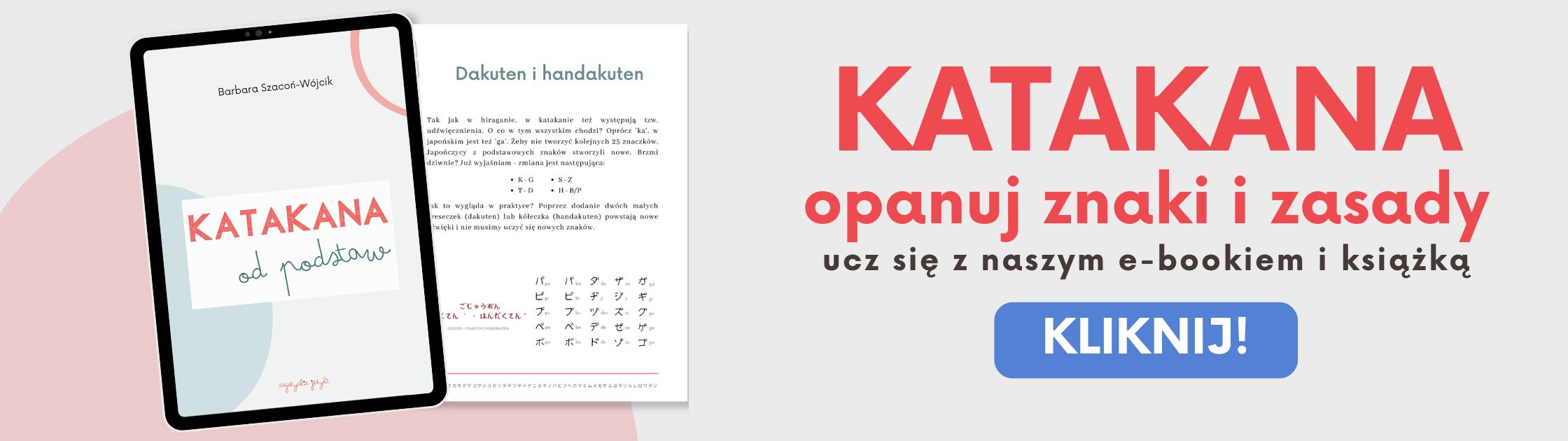 Chcesz nauczyć się katakany? Masz problem ze wszystkimi zasadami, jakie w niej obowiązują? Zapoznaj się z e-bookiem dostępnym w naszej ofercie. Wyjaśniamy w nim wszystkie aspekty dotyczące użycia znaków. Znajdziesz w nim także wiele ćwiczeń, dzięki którym szybciej przyswoisz katakanę.