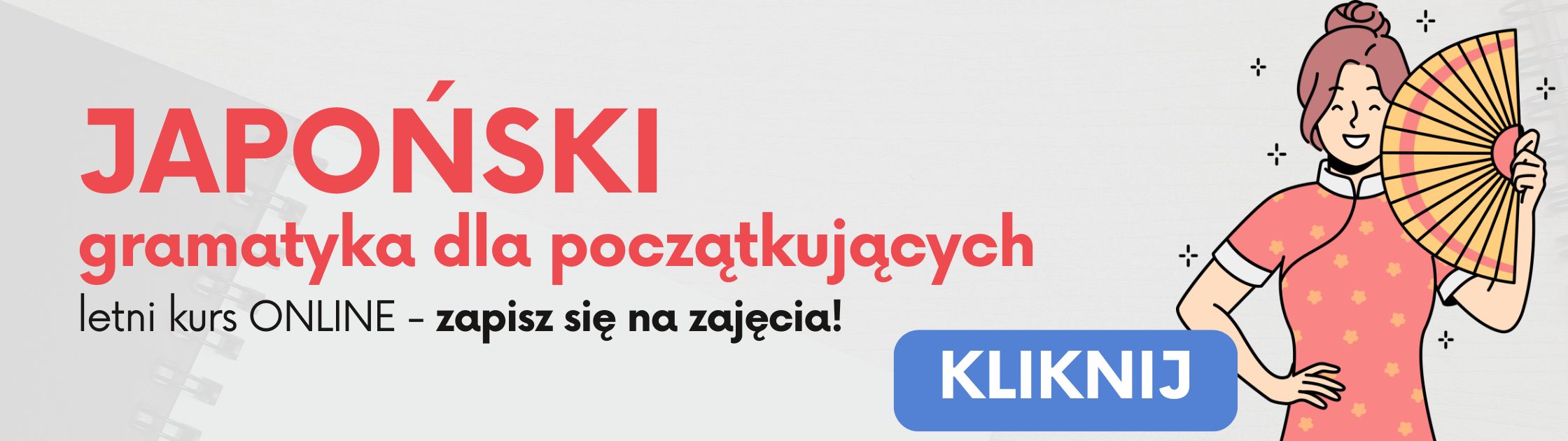 Chcesz jeszcze lepiej opanować podawanie czasu po japońsku, a przy okazji nauczyć się dodatkowych kwestii, takich jak mówienie o sobie, liczenie czy używanie przymiotników? Zapisz się na letni kurs japońskiej gramatyki! Start już 4 sierpnia - zajęcia w poniedziałki 18:30 - 19:30 i czwartki 17:10 - 18:10. W cenie Japoński na start 3 + tematyczne e-booki.