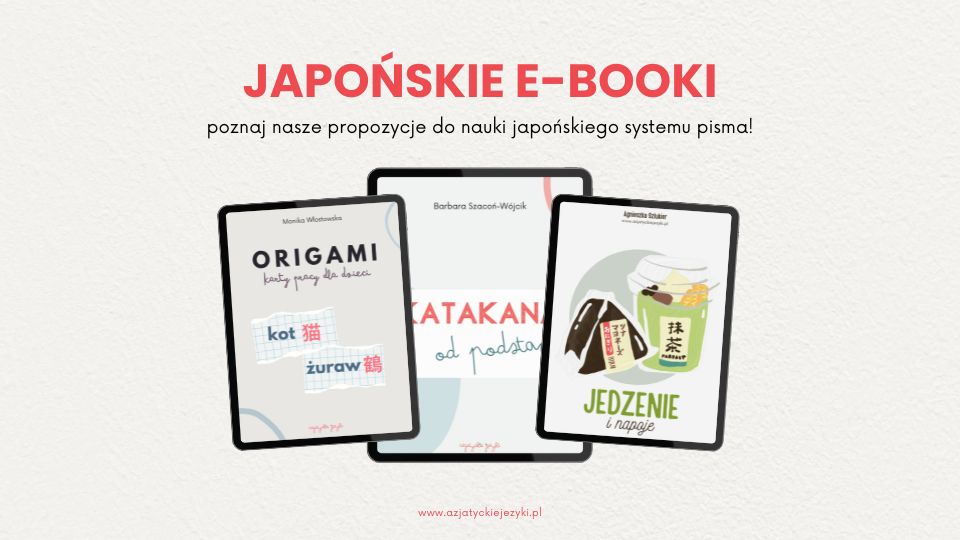 - E-book Katakana od podstaw - pozycja bardzo podobna do poprzedniej, ale skupiająca się na drugim sylabariuszu, czyli katakanie. Tu także jest teoria, tabelka ze znakami, kratki do ćwiczenia zapisu oraz zadania. Produkt ten można kupić również w formie zeszytu ćwiczeń.