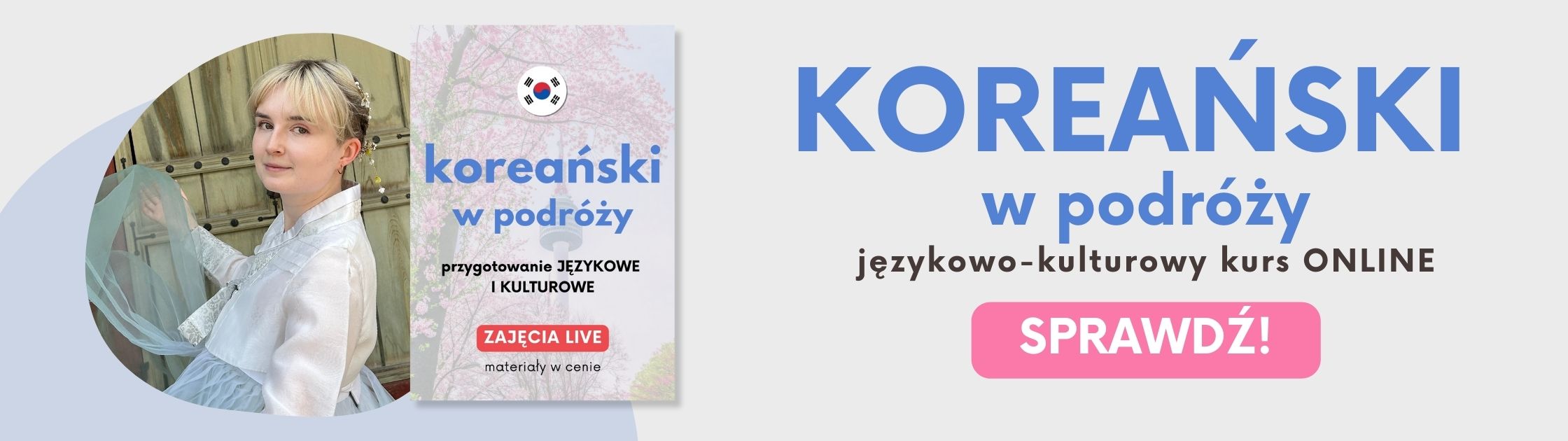 Jeżeli wybierasz się w podróż do Korei Południowej, mamy coś, co Cię zainteresuje: kurs Koreański w podróży - przygotowanie językowe i kulturowe. Zawiera cztery bloki tematyczne po 90 minut, a każdy z nich podzielony jest na dwie części. Wszystkie lekcje składają się z rozbudowanej części kulturowej, tematycznych list słówek i wyrażeń oraz krótkiego omówienia wybranego zagadnienia gramatycznego. Bloki to wiosna, lato, jesień i zima. Lekcje są dobrym wyborem nawet dla osób, które nie znają koreańskiego alfabetu, ponieważ część kulturowa nie wymaga jego znajomości. Zajrzyj tutaj, aby poznać więcej szczegółów i zapisać się na zajęcia.