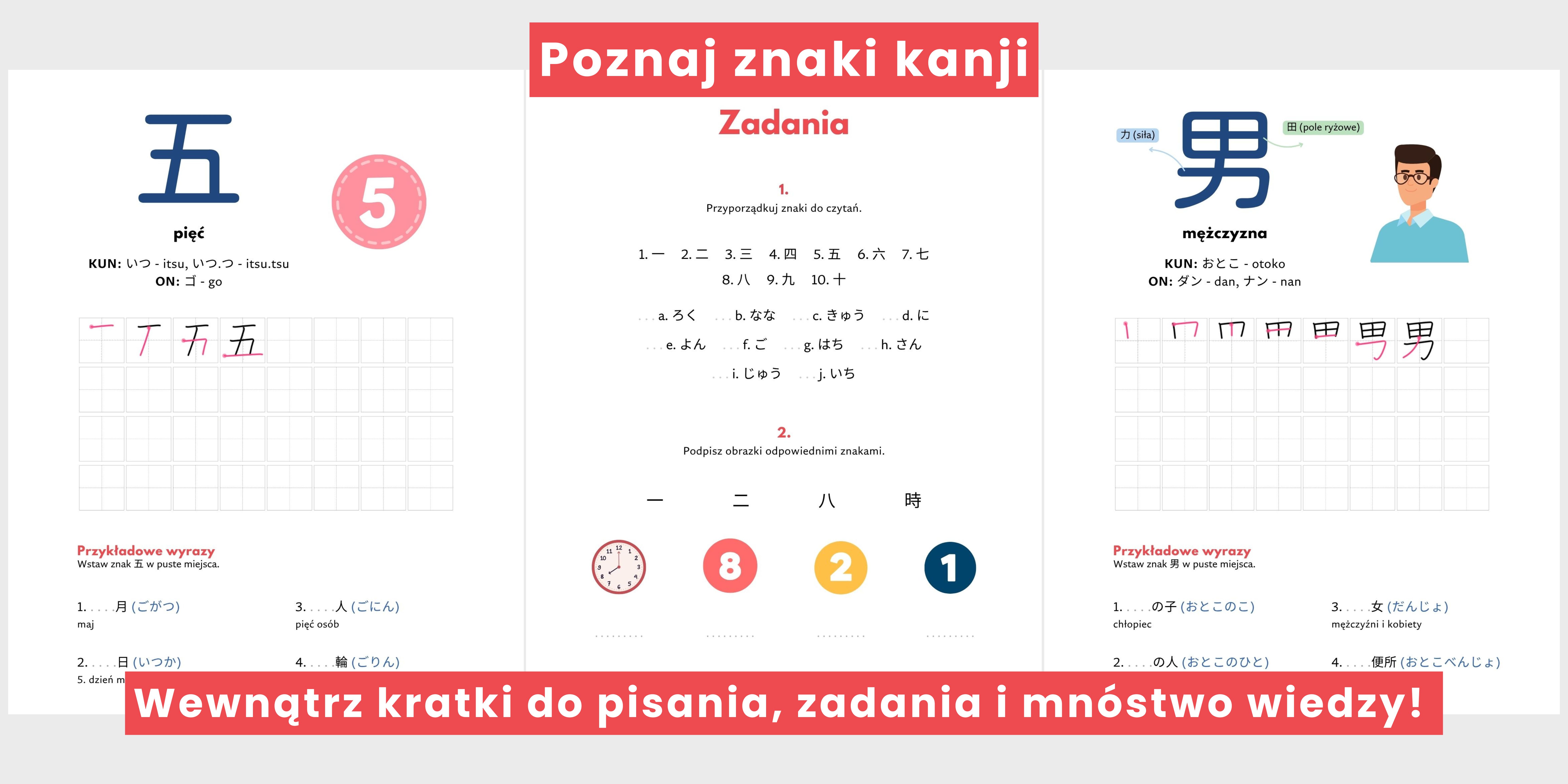- opracowanie ponad 80 kanji wraz z kun i on, kratkami do pisania oraz przykładowymi wyrazami,