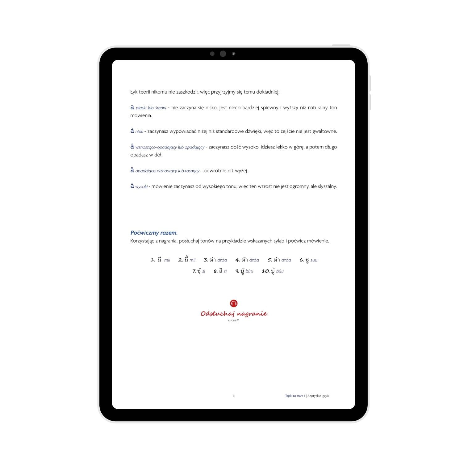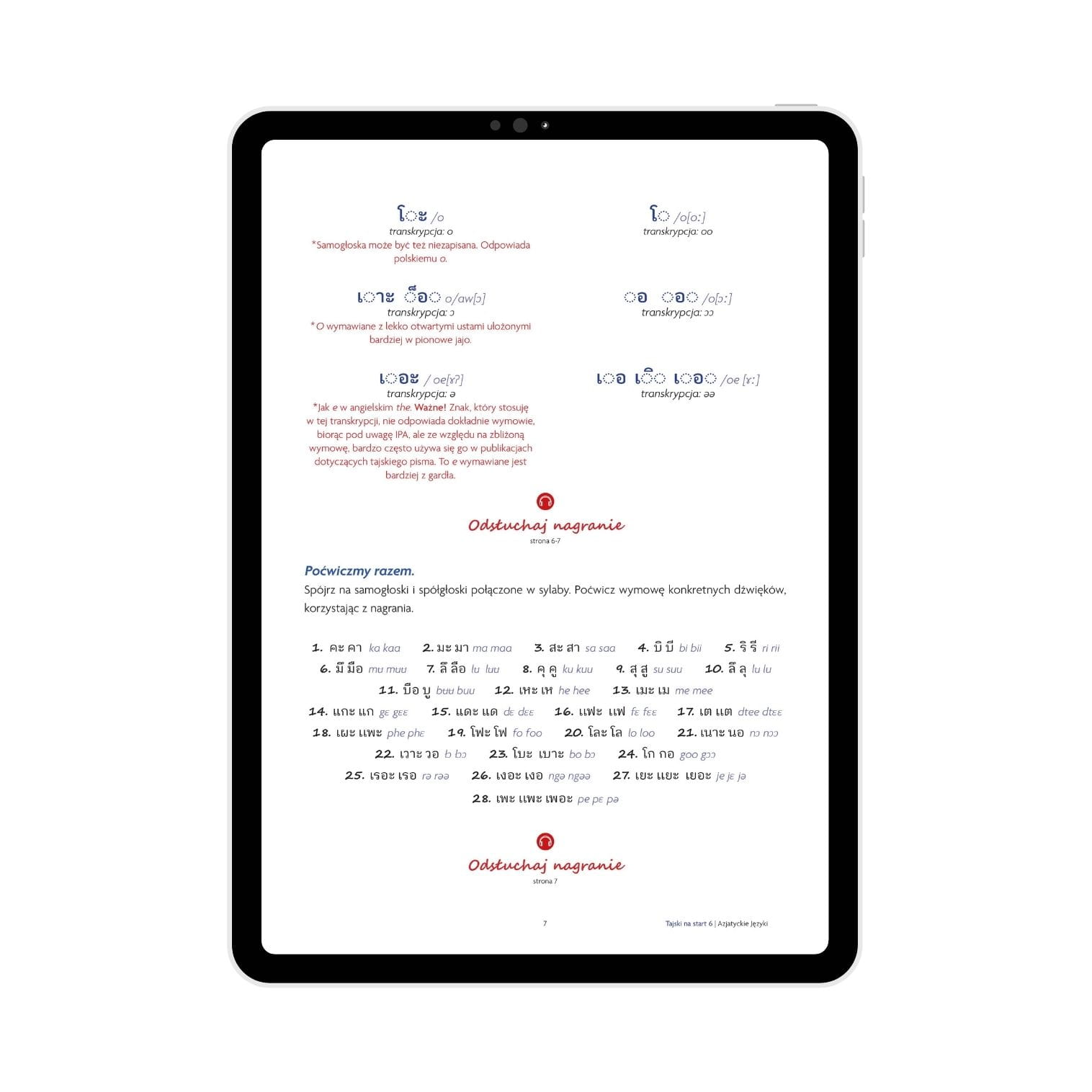 Nie zapomniałyśmy o wymowie, czyli ważnym elemencie w nauce tajskiego. Wspólnie omówimy spółgłoski, różnice między samogłoskami oraz tony. To e-book z nagraniami.