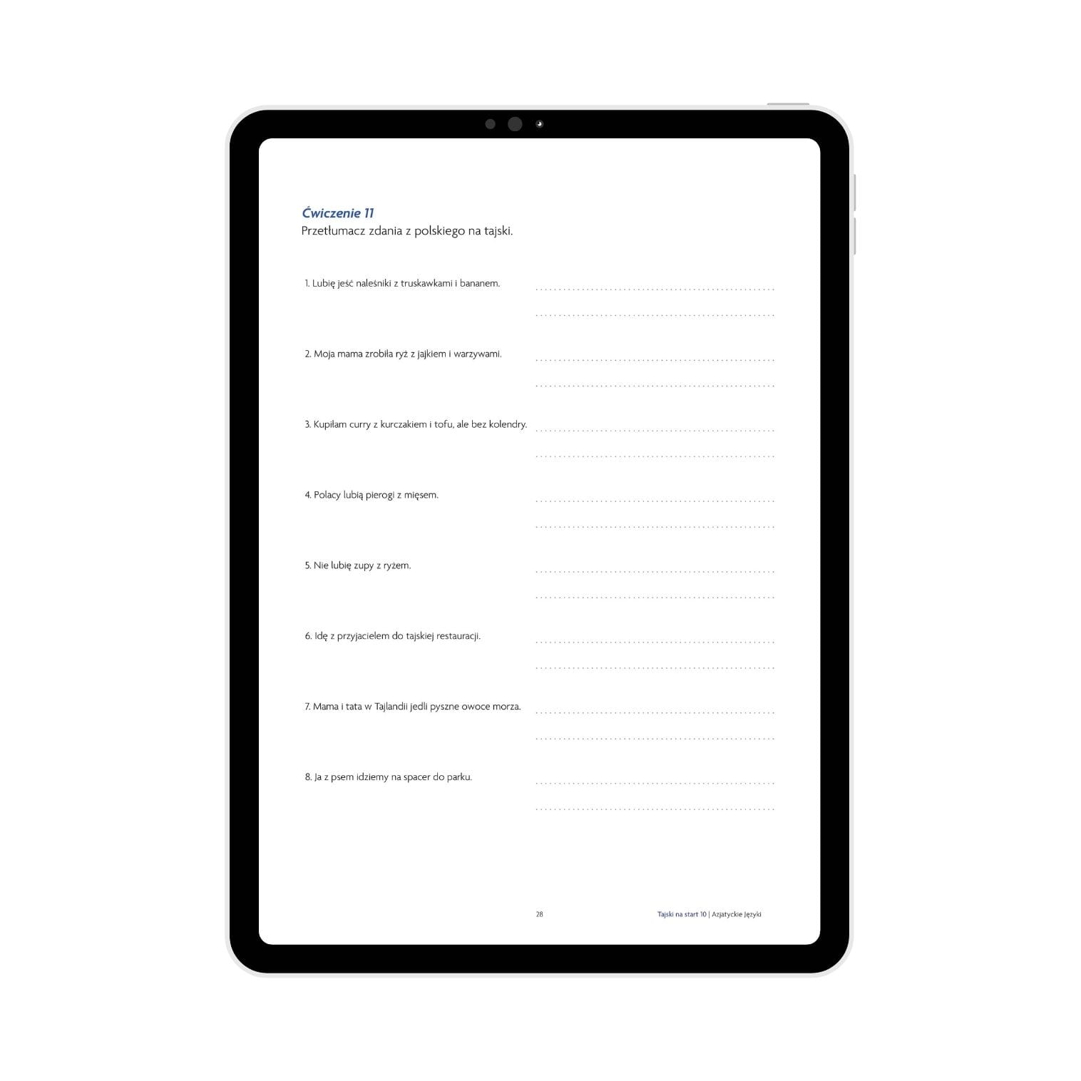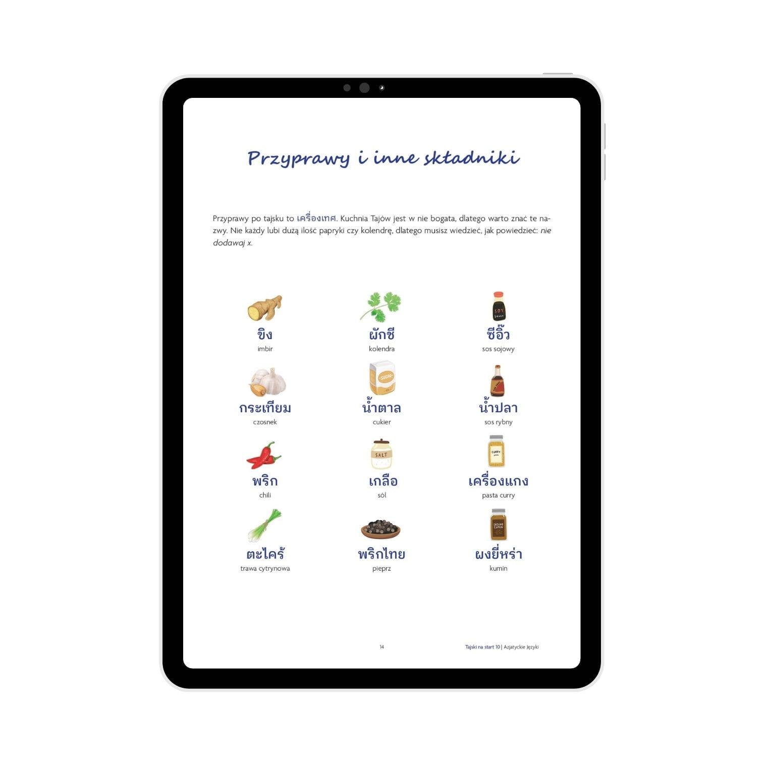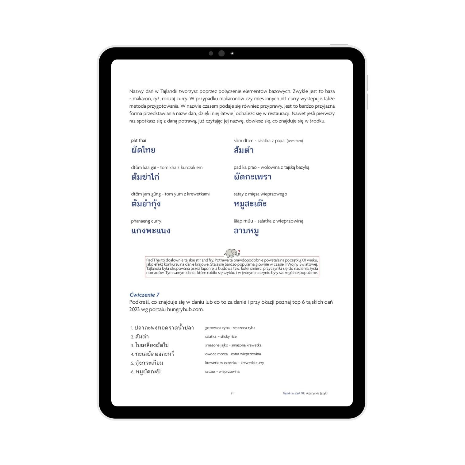Środek publikacji wypełniają ciekawe zadania, klarowne wyjaśnienia oraz duża ilość słownictwa, które przyda się w codziennych rozmowach z Tajami. Wszystko to zawiera się w atrakcyjnym wizualnie e-booku, który sprawdzi się dla zupełnie początkujących i tych już trochę bardziej zaawansowanych.