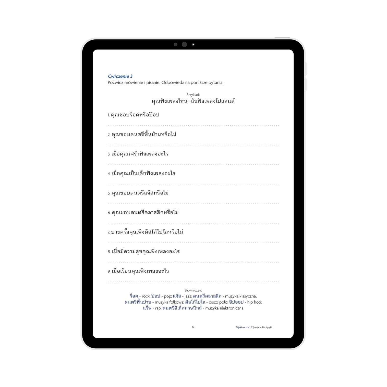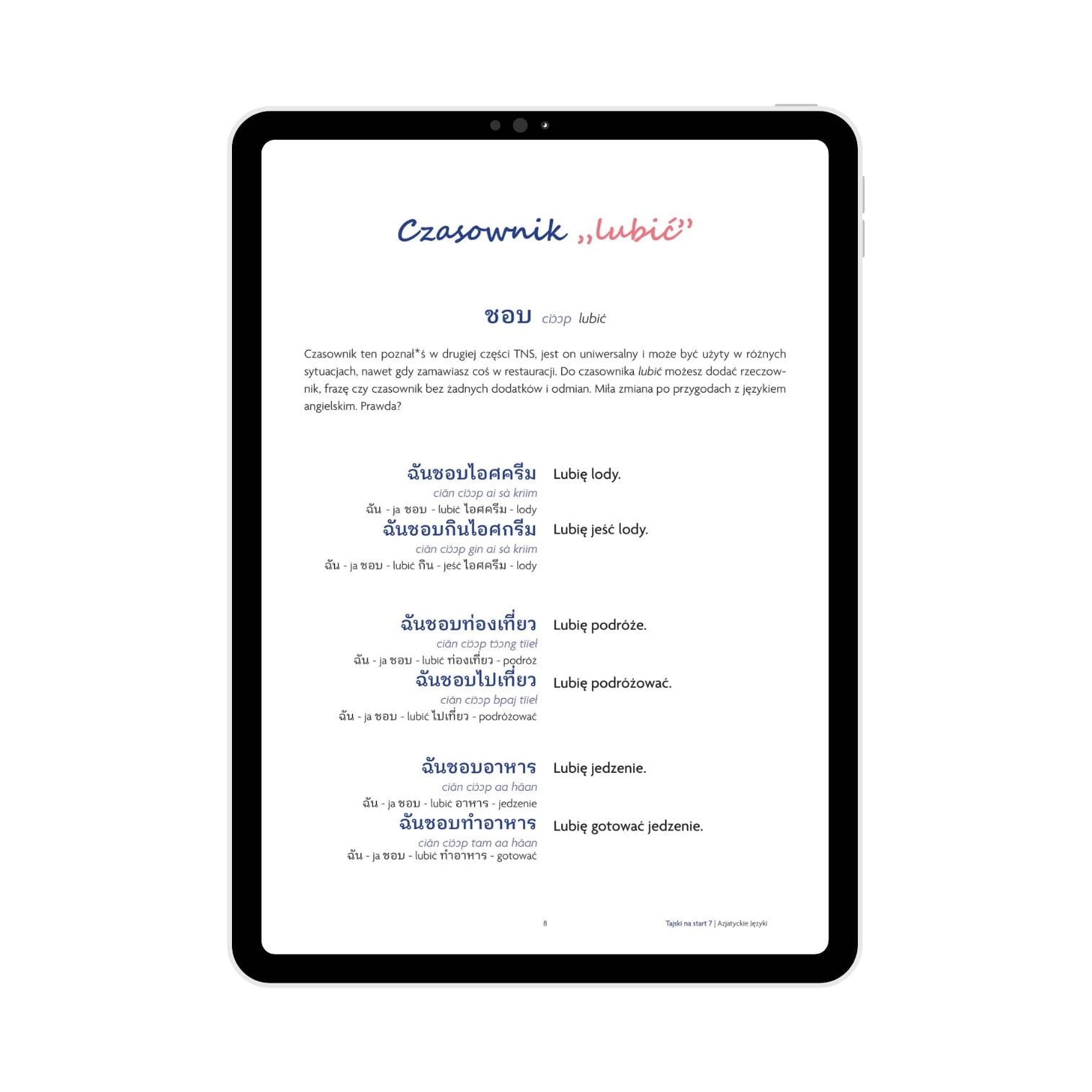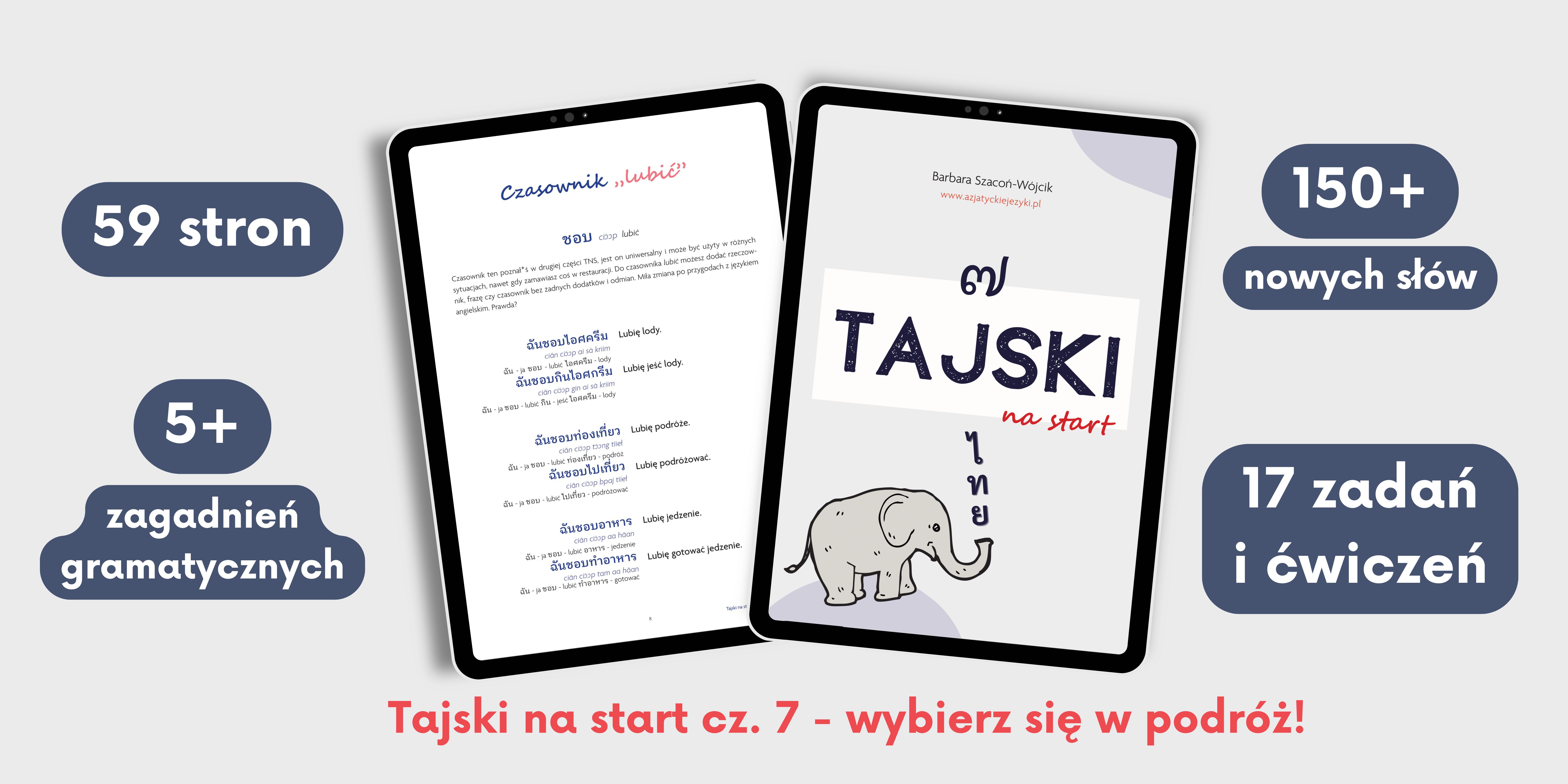 Jeżeli szukasz polskojęzycznych materiałów do nauki tajskiego, ten e-book będzie idealnym wyborem. Tajski na start to wyjątkowa pozycja. Składa się z rozbudowanej części merytorycznej, a także autorskich ćwiczeń umożliwiających utrwalenie zdobytych umiejętności. Na uwagę zasługuje także oryginalna, estetycznie wyglądająca oprawa graficzna.