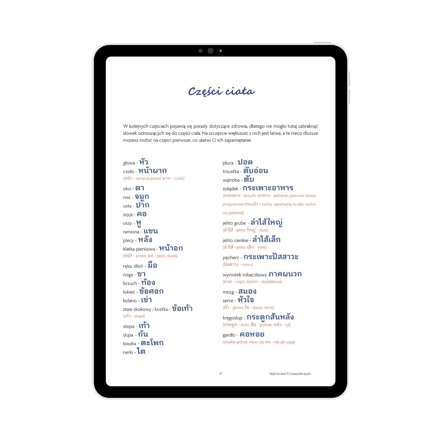 Wewnątrz znajdziesz m.in. przydatne słownictwo i wyjaśnienie sposobu wymowy. Nie brakuje oczywiście wyjaśnienia zagadnień gramatycznych. Tajski na start zawiera wszystkie niezbędne informacje potrzebne do opanowania podstaw języka. Dodatkowe atuty tej pozycji to atrakcyjny wygląd oraz autorskie ćwiczenia utrwalające wiedzę.