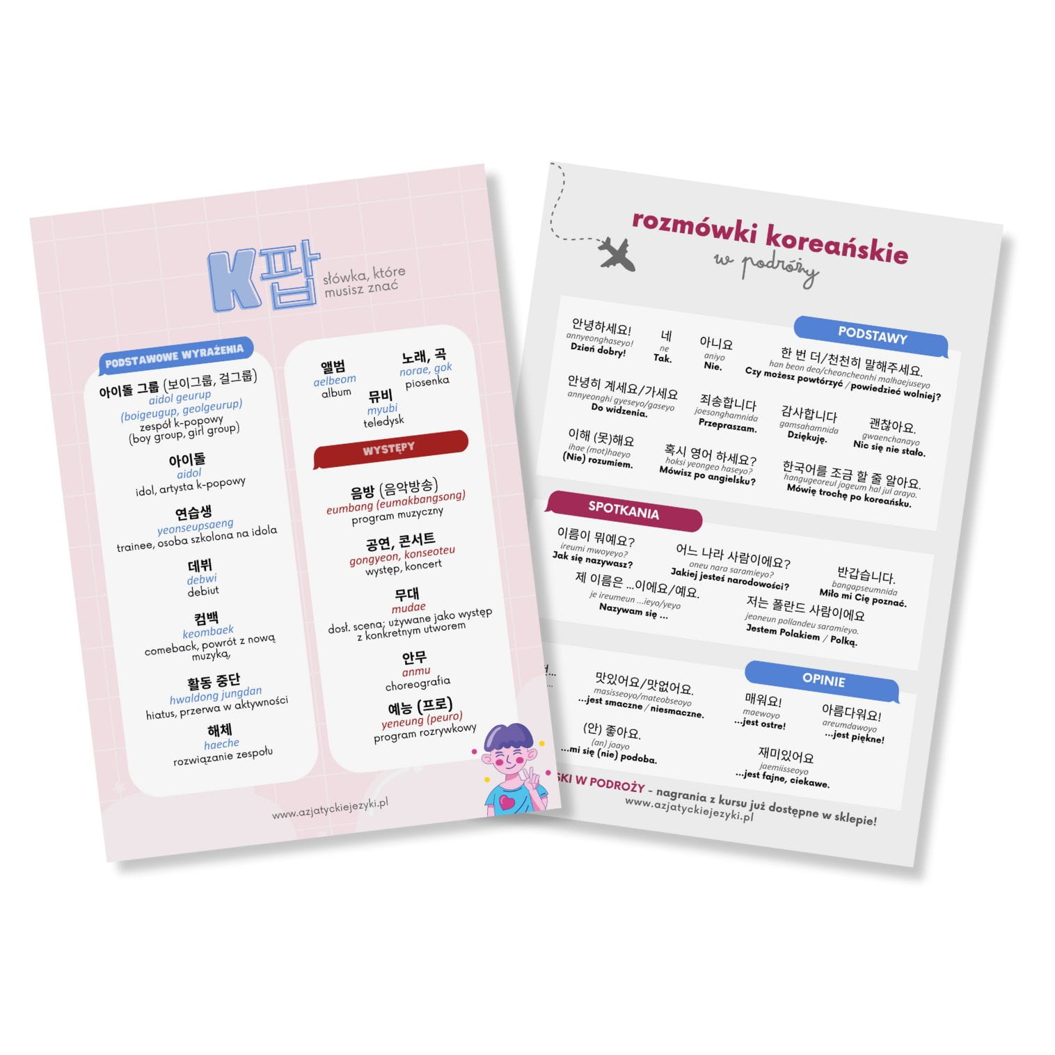 Wkładki muzyczne to trzy unikalne plansze edukacyjne zaprojektowane z myślą o fanach K-popu. Każda z nich zawiera praktyczne słówka i zwroty, które przydadzą się na koncercie, w social mediach czy podczas rozmowy z innym fanem.