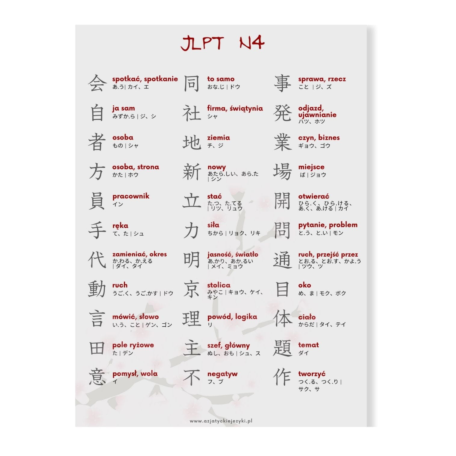Znaki Kanji JLPT N5 N4 N3 N2 - plansze/wkładki z Kanji na JLPT od N5 do N2