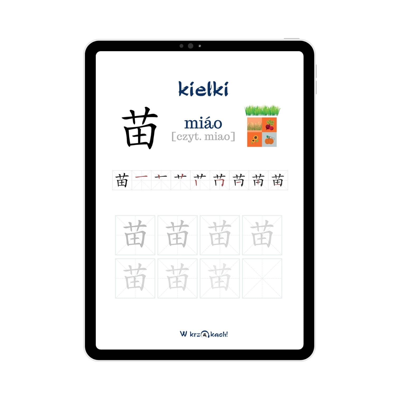 Zeszyt ćwiczeń został bardzo starannie przygotowany. Jest atrakcyjny wizualnie i zachęca do doskonalenia językowych umiejętności. Karty pracy do chińskiego pokazują kolejność stawiania kresek przy każdym prezentowanym znaku. Umieściliśmy także zapis w pinyinie, znaczenie i oczywiście kratki do samodzielnych prób zapisu hanzi.